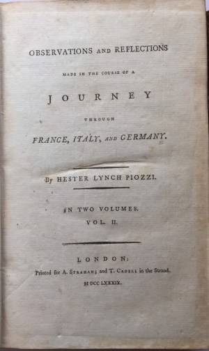 3. Observations and Reflections Made in the Course of a Journey through France, Italy, and Germany. By Hester Lynch Piozzi. London: Printed for A. Strahan; and T. Cadell in the Strand, 1789. 1st ed. 2 vols.