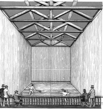 “Rackets or racquets is an indoor racket sport played in the United Kingdom, Republic of Ireland, United States, and Canada. Historians generally assert that rackets began as an 18th-century pastime in London’s King’s Bench and Fleet debtors prisons. The prisoners modified the game of fives by using tennis rackets to speed up the action. They played against the prison wall, sometimes at a corner to add a sidewall to the game. Rackets then became popular outside the prison, played in alleys behind pubs. It spread to schools, first using school walls, and later with proper four-wall courts being specially constructed for the game. And later, specific indoor courts were built as shown here at Eglinton Castle in 1842.”