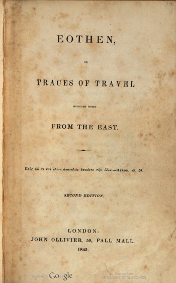 Alexander William Kinglake. Eothen; or Traces of travel brought home from the East. London: J Ollivier, 1844.