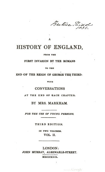 Mrs. Markham (i.e. Elizabeth Penrose). A History of England from the First Invasion by the Romans to the End of the Reign of George III. (1823).