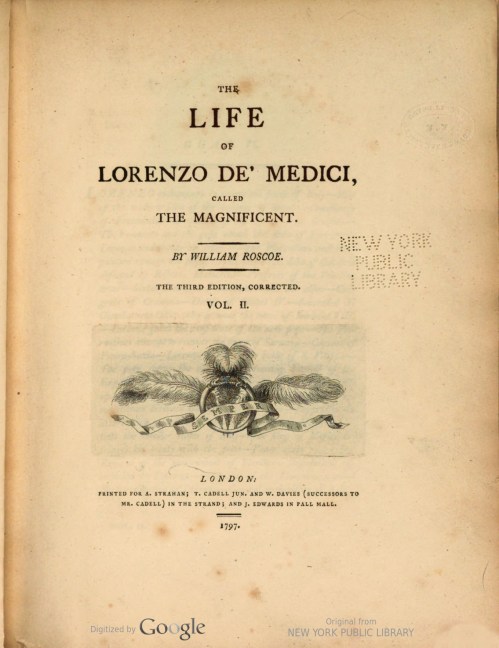 William Roscoe. The Life of Lorenzo de’ Medici called the magnificent. I-II. London: Printed by J. M’Creery and Sold by J. Edwards, 1795.