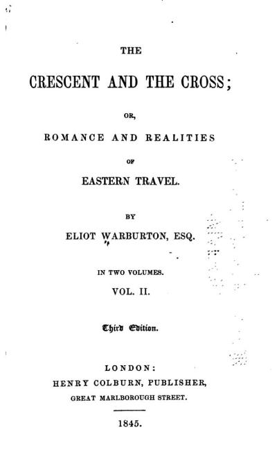 Eliot Warburton. The Crescent and the Cross, Or, Romance and Realities of Eastern Travel. London: Henry Colburn, 1845.