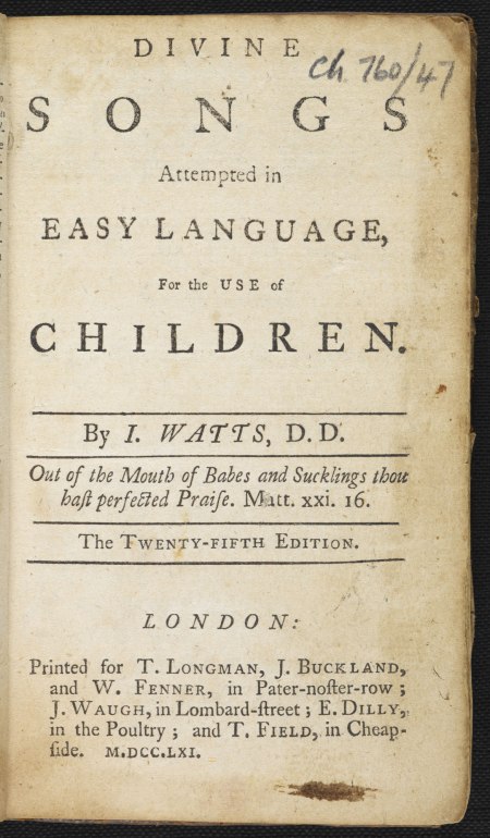 So, what this is anybody’s guess! No knowing if they were religious songs or something more light-hearted. There is listed in the Knight Collection a book titled Divine Songs, by Isaac Watts – no mention of this either in the GPL 1818 or Chawton 1908 catalogues, but it was published in 1715 as Divine Songs Attempted in Easy Language for the Use of Children (also known as Divine and Moral Songs for Children, a collection of didactic, moralistic poetry for children that for the next 150 years remained one of the most popular of children’s books and went into many editions. It looks like something that might have been / should have been in the GPL, and something Charles would have been familiar with, and likely used so much it wasn’t on the shelf during the cataloguing process – but I am completely digressing / guessing here!