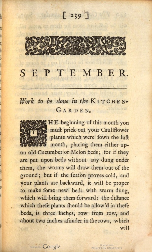 Since this is September, here’s a page sample for what you should be doing in your Kitchen Garden [this is from the 1737 4th ed. at HathiTrust] – it’s all about your cauliflower – there are succeeding entries for work to be done in the Fruit Garden, the Flower Garden, the Pleasure Garden, and the Greenhouse and Stove. You shall be very busy!