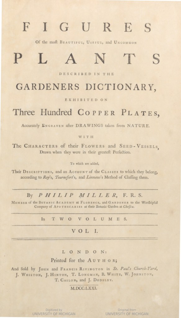Figures Of the most Beautiful, Useful, and Uncommon Plants described in The Gardeners Dictionary, exhibited on Three Hundred Copper Plates, Accurately Engraven after Drawings taken from Nature. With The Characters of their Flowers and Seed-Vessels, Drawn when they were in their greatest Perfection. To which are added, Their Descriptions, and an Account of the Classes to which they belong, according to Ray’s, Tournefort’s, and Linnæus’s Method of Classing them. By Philip Miller, F.R.S. Member of the Botanic Academy at Florence, and Gardener to the Worshipful Company of Apothecaries at their Botanic Garden at Chelsea. In Two Volumes.