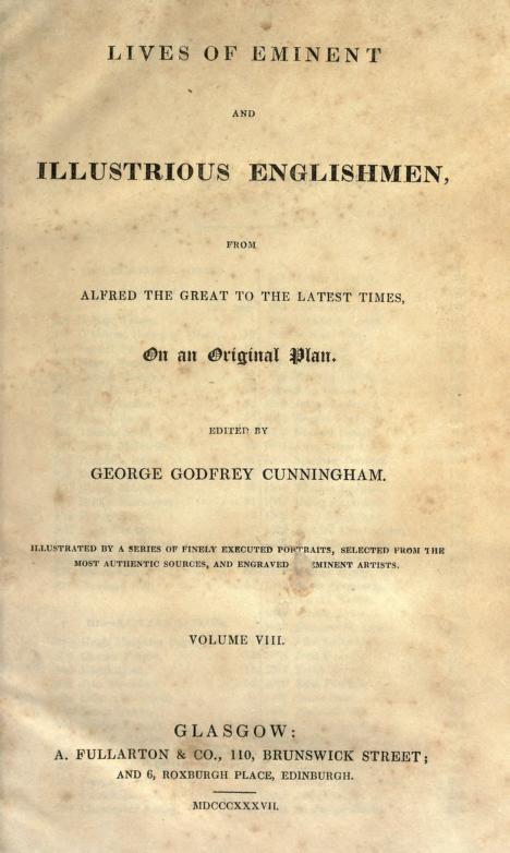 Charles must mean this: Lives of eminent and illustrious Englishmen, from Alfred the Great to the latest times, on an original plan. George Godfrey Cunningham. Glasgow, A. Fullarton & Co., 1834-42.