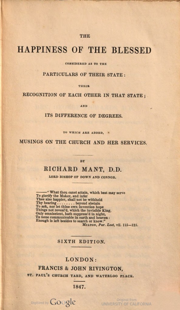 The Happiness of the Blessed considered as to the particulars of their state; their recognition of each other in that state; and its difference of degrees. … To which are added Musings on the Church and her Services [in verse]. By Richard Mant, successively Bishop of Killaloe, and of Down, Connor and Dromore. London, 1833.