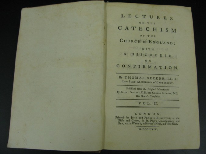 Lectures on the Catechism of the Church of England: with A Discourse on Confirmation. By Thomas Secker, LL.D. Late Lord Archbishop of Canterbury. Published from the Original Manuscripts By Beilby Porteus, D.D. and George Stinton, D.D. His Grace’s Chaplains. London, 1769.