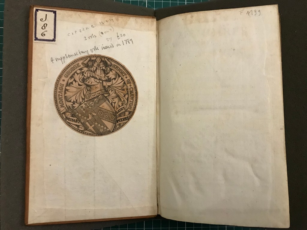 Orrery, John Boyle, Earl of, 1707-1762. Letters from Italy in the years 1754 and 1755. London: B. White, 1773. With the armorial bookplate : Montagu George, Knight of Chawton [a common cataloguing error… I think Montagu would approve of being catalogued as a knight…]