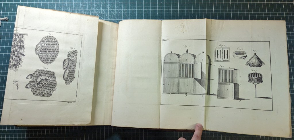 A Treatise on the Management of Bees is a manual on beekeeping and a natural history of bees, wasps and hornets by the English beekeeper Thomas Wildman. Published in 1768, the book offered new advice for the management of bees and demonstrated Wildman’s new design for hives. Wildman’s hive included a removable woven lid and a set of seven frames from which bees could build their honeycomb. He also advocated for the use of multiple skeps (domed baskets used for beehives) so that bees could freely move to a new skep once the old one was full, allowing for the easy retrieval of honey. These innovations removed the need to suffocate the colony prior to the harvesting of honey, allowing for the bees to survive for many years.