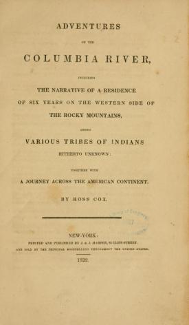 This title was initially indecipherable, but further sleuthing on Ms. Jones’s part tuned up a second reference to Ross Cox, so we know Charles was referring to Cox’s Adventures on the Columbia River (Henry Colburn & Richard Bentley, London, 1831).