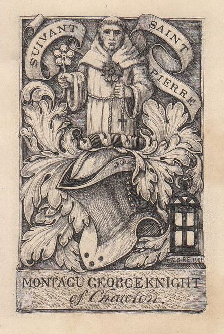 Edward’s son, known as Edward Knight, Jr. (1794-1879), used the same bookplate as his father as far as is known – there are some books with this bookplate but with Edward Jr’s signature. But his son, Montagu George Knight (MGK) (1844-1914), created his own, playing with all the family arms and added even more to the mix.