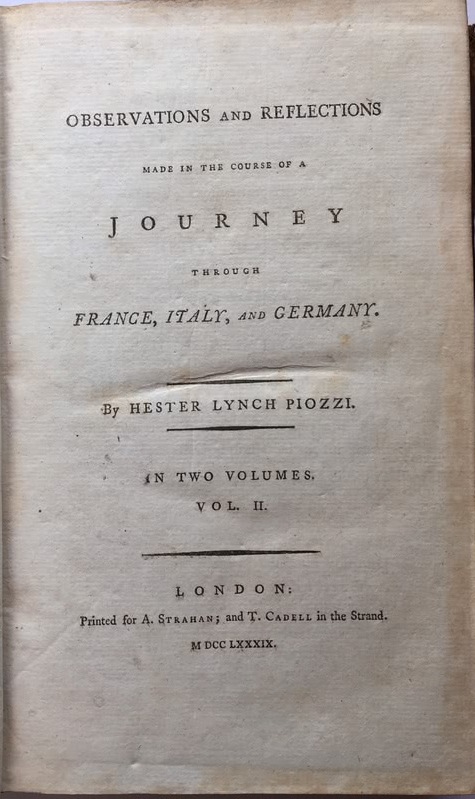 Hesther [sic] Lynch Piozzi. London: Printed for T. Cadell in the Strand, 1786. 1st ed.